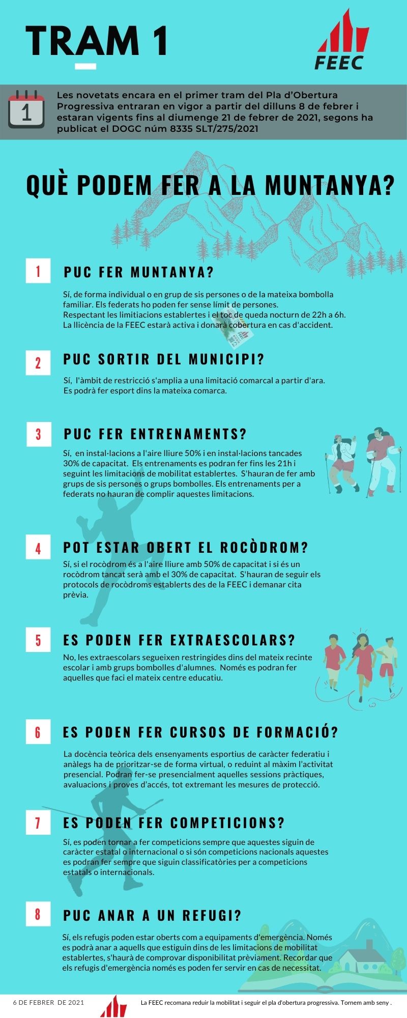 Pel que fa a la pràctica esportiva i esports de muntanya des del Departament de Salut de la Generalitat s’ha decidit que es podrà practicar esport a l’aire lliure. Aquest es podrà fer dins de la comarca on es resideix durant la setmana i de forma individual, amb grups màxims de 6 persones o grups ‘bombolles’. Els federats no tindran limitació sempre que el grup siguin tots federats per a realitzar entrenaments.