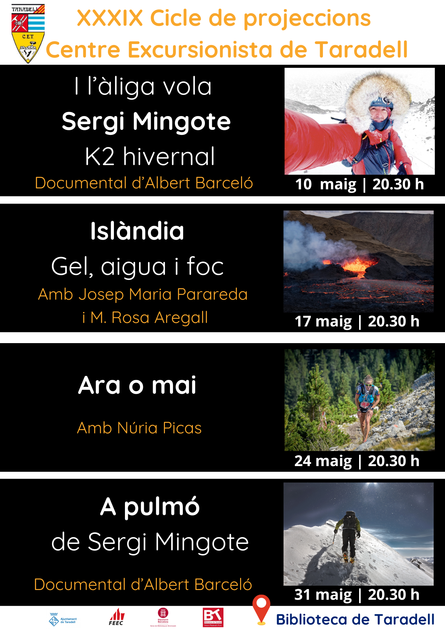 Us presentarem el 39è cicle de projeccions del Centre Excursionista Taradell que com és habitual constarà de quatre sessions que es faran els divendres dia 10, 17, 24 i 31 de maig a la Biblioteca Antoni Pladevall i Font de Taradell, a 2/4 de 9 del vespre.